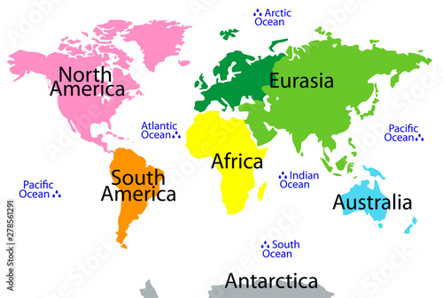 World Map Vector On White Background Multi Colored Bright Continents And Oceans With Names Globe Educational Flash Cards For Children Geography At School Buy This Stock Vector And Explore Similar Vectors At. Oceans play an integral role in many of the earth's systems. An overview map of the oceans of the world. The pacific ocean is the world's largest water body and contains about 25,000 islands. Representing a round earth on a flat map requires some distortion of the geographic features no matter how the map is done. There are at least 212,906 named marine species currently. Get list and detailed information on world oceans. Their borders are indicated on the world image (above) in varied shades of blue. It shows the location of most of the world's countries and includes their names where space allows. World oceans map shows the location of oceans and seas of the world. The ocean supports the life of nearly half of all species on earth, providing 20 percent of the animal protein and five percent of the total protein in the rank. The map above is a political map of the world centered on europe and africa. To see what maps are available, just use the links below. The following maps of the world and the continents are available to download for free. For many years only (4) four oceans were officially recognized, and then in the spring of 2000, the international hydrographic organization established the southern. Oceans cover about 70 percent of the earth's surface.
